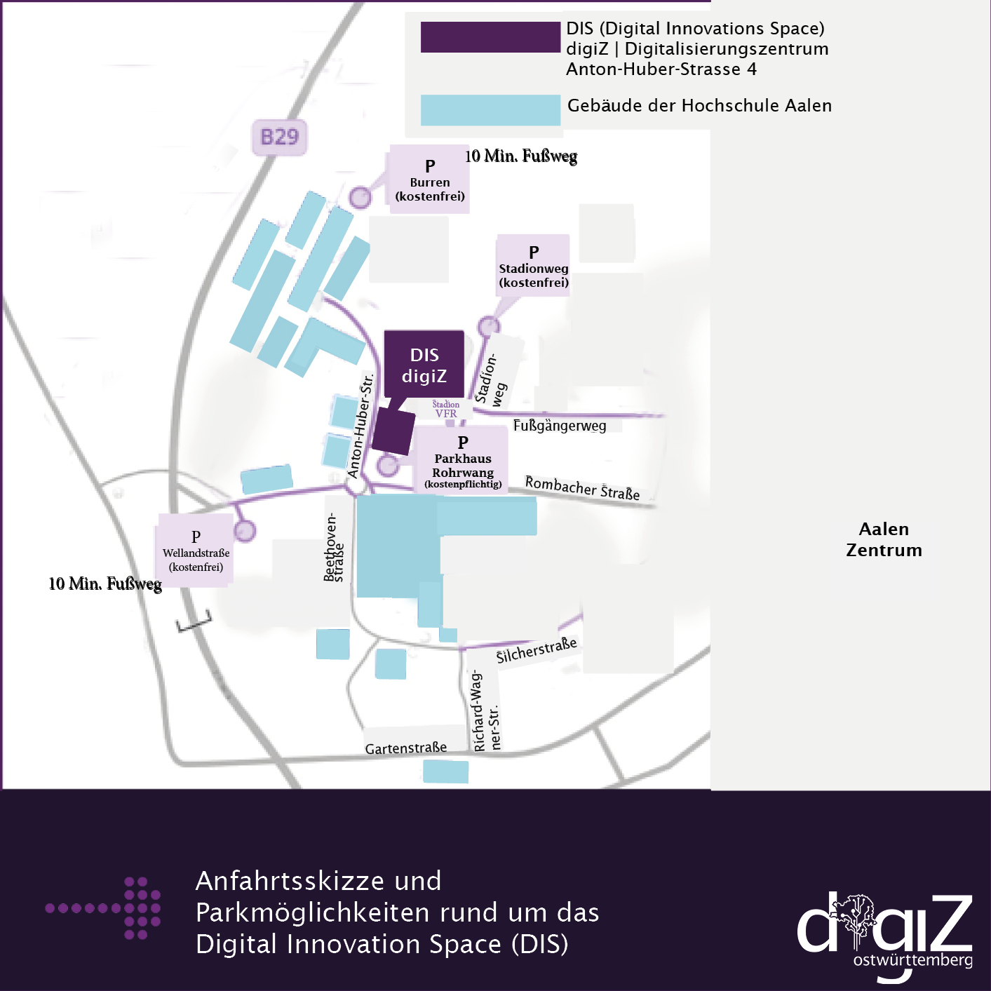 Das digiZ | Digitalisierungszentrum Ostwürttemberg bedindet sich in unmittelbarer Nähe zur Hochschule Aalen und ist sowohl mit dem Auto als auch mit öffentlichen Verkehrsmitteln gut erreichbar.